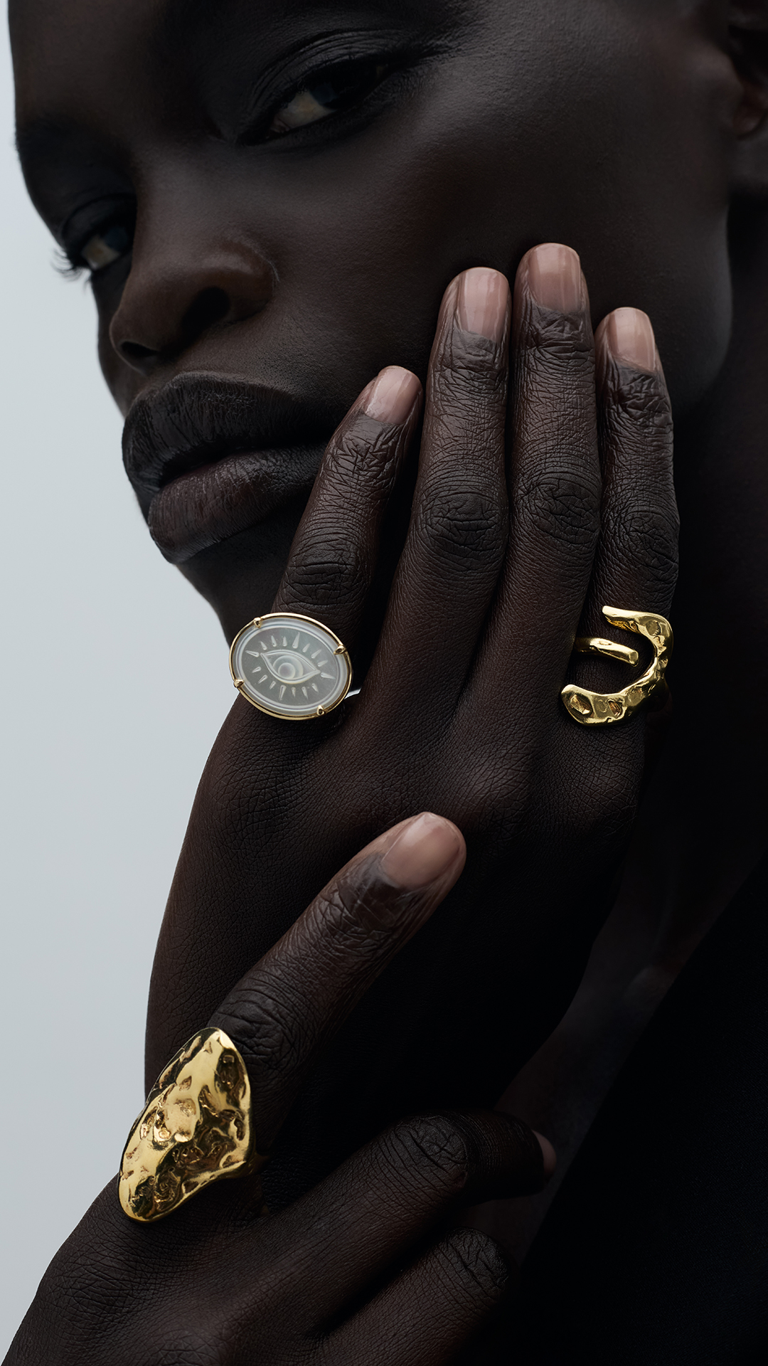 A step towards enlightenment. Your personal amulet of spiritual awakening. Inspired by the symbolism of the third eye, the opening of which is believed to grant clarity of vision, hearing, and feeling, this 14k gold ring, centered with a hand-carved mother of pearl using the relief technique, represents a gateway to higher consciousness and profound spiritual insight.